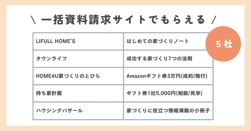 プレゼント特典 | はじめての家づくりノート | 成功する家づくり7つの法則 | Amazonギフト券3万円 ※「HOME4U」経由で注文住宅を契約・施工で | ギフト券 1社につき 5,000円 ※相談・見学の予約来場で | 家づくりに役立つ情報満載の小冊子 ※1人3冊まで |
