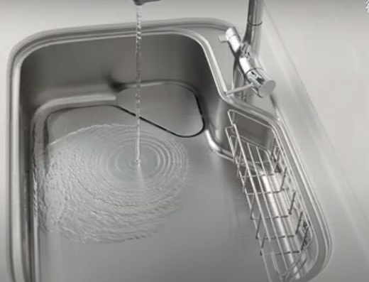②流レールシンク | シンク端の「流レール」にゴミが入り水流に押されて排水溝に集まる仕組み。静音性が高い。シンク裏の底面だけでなく側面にまで広がった制振構造が特徴的。 |