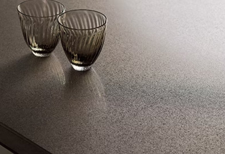 セラミックトップのキッチンカウンターは高温のフライパンや鍋、熱くなったトレイもそのまま置ける シンクもセラミックトップ同様に熱やキズに強い素材で変色にも強いので長く使える セラミックトップに合わせた色を選択可能で統一感あるデザインに仕上がる レンジフードにはフッ素塗装や親水性塗装が施されており汚れが付きずらくお手入れが簡単 | キッチンカラーを黒系にすると水垢が目立ちやすい セラミック素材は硬いため食器を置く音が気になりやすい |